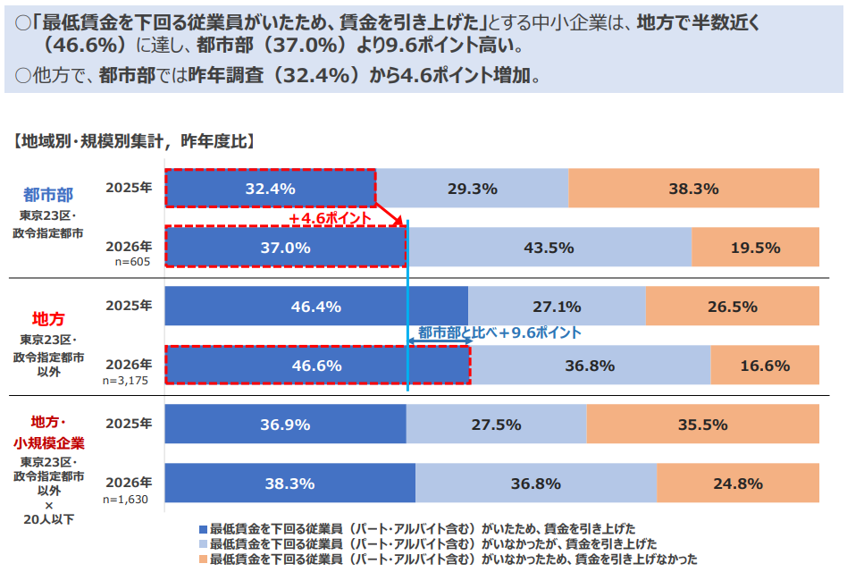 出典:東京商工会議所「『中小企業における最低賃金の影響に関する調査』の集計結果について ~2025年度の最低賃金引上げの『影響』や『負担感』は、地方において深刻な状況。近年の大幅引上げにより、都市部や正社員でも影響が拡大~」(https://www.tokyo-cci.or.jp/page.jsp?id=1208992)