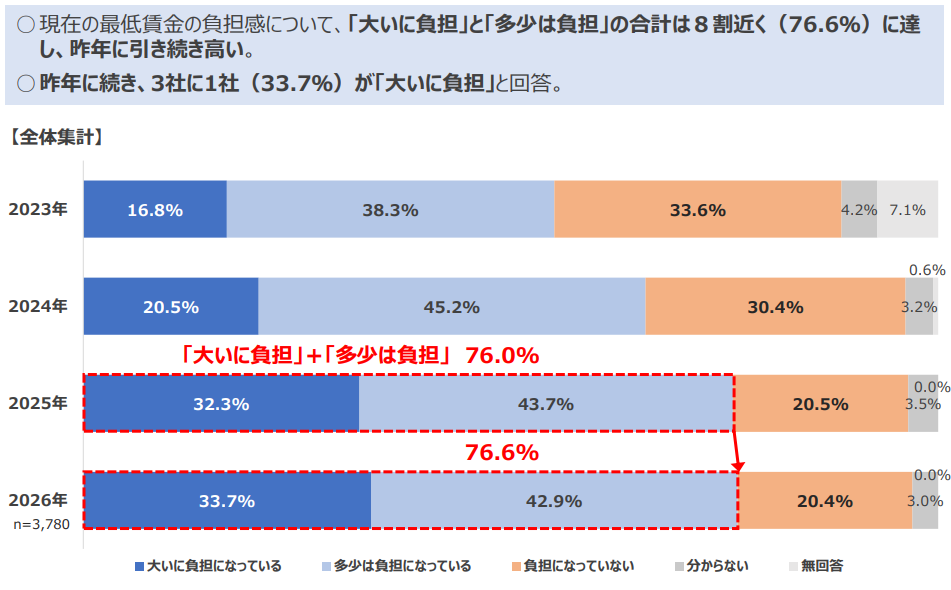 現在の最低賃金について「大いに負担」「多少の負担」とする企業は合計76.6%に達しました。地方では77.9%、都市部では69.8%となり、地方が8.1ポイント高い結果でした。