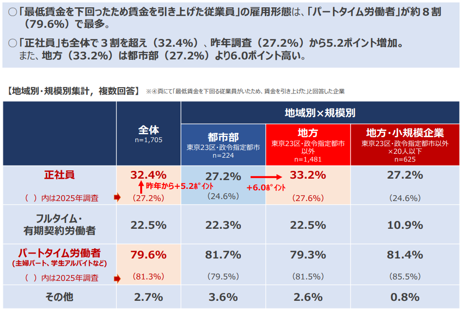 最低賃金を下回ったため賃金を引き上げた従業員の雇用形態では、「パートタイム労働者」が79.6%を占める一方、「正社員」も32.4%に上りました。正社員については昨年調査の27.2%から5.2ポイント増加しており、近年の大幅引上げにより正社員層にも影響が及んでいる実態が明らかになりました。
