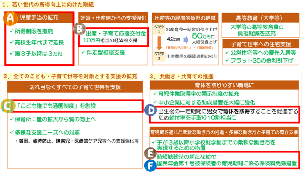 上記のうち、A 児童手当の拡充、B 出産・子育て応援交付金、D 出生後育児休業給付およびE 育児時短就業給付はすでに開始しており、C こども誰でも通園制度およびE 国保第1号被保険者保険料免除は令和8年度実施のスケジュールとなっています。