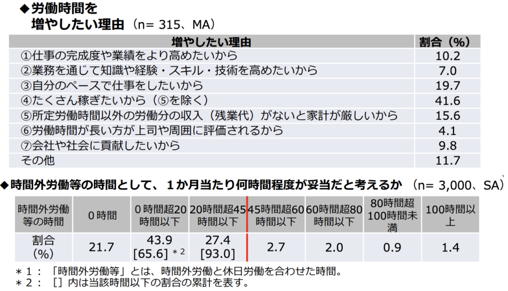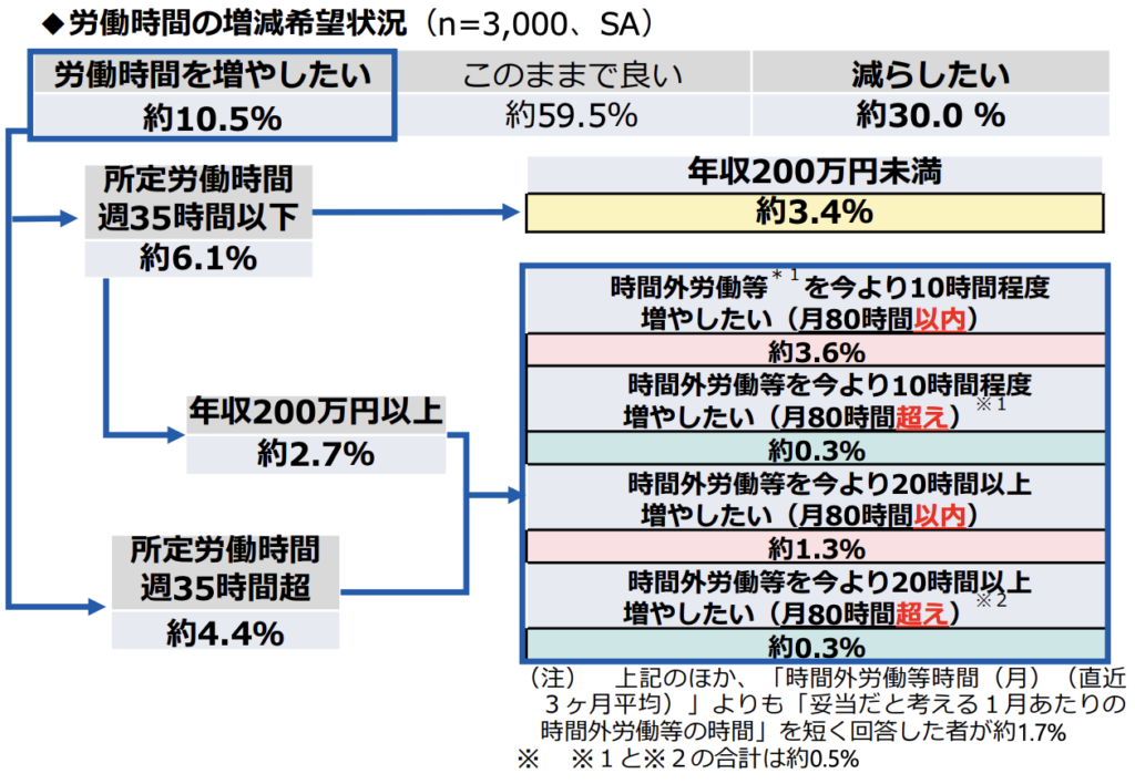 労働者の労働時間に対する意識では、「このままでいい」が59.5%と過半数を占める一方、「減らしたい」が30.0%、「増やしたい」が10.5%となりました。増やしたい理由としては「たくさん稼ぎたい(残業代を含む)」が41.6%、「所定労働時間外の労働分の収入がないと家計が厳しい」が15.6%と、収入面での要望が示されています。