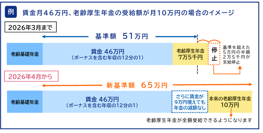 2026年4月より、在職老齢年金制度における支給停止調整額が見直され、これまでの月額51万円から月額65万円へ引き上げられます。