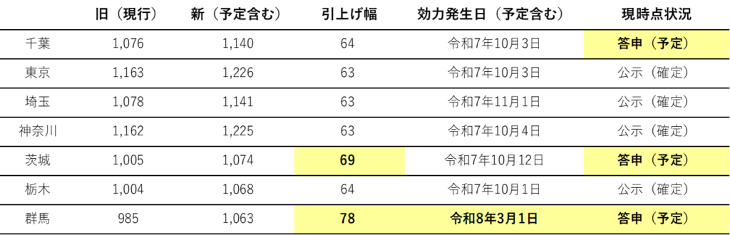 今回の最低賃金の引上げについて、本投稿時点における関東各都県の最低賃金額及び効力発生日をまとめましたのでご覧ください。