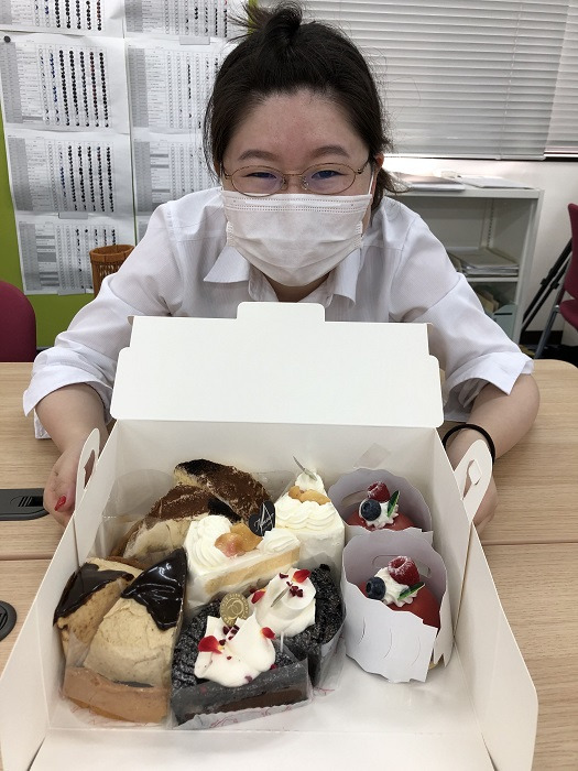 みんなでおめでとう!と言って、業務の合間に美味しいケーキをいただきました。