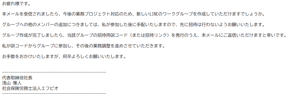 現在、弊所の名称を騙り、LINEグループへの加入を促す「フィッシングメール」が送信されていることを確認しております。