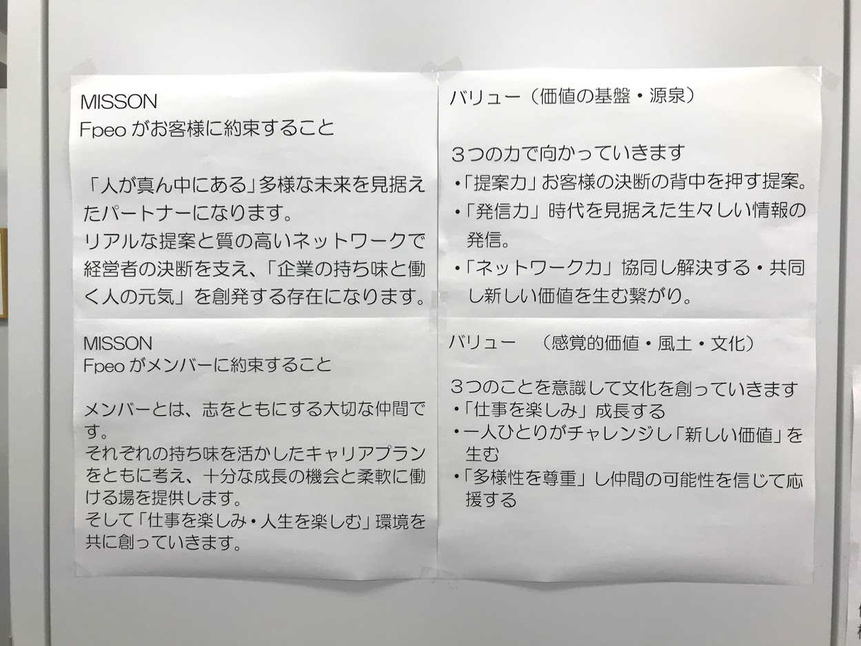 年始に行う1日研修とは違い、今回の研修は新法人Fpeoのビジョン・ミッション・バリューを共有し、浸透させ、Fpeoの目指すべき方向性の共通認識を持つための研修です。