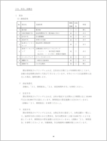 主に「就業規則や雇用契約書の内容・運用」「労働時間・残業代」「社会保険」「紛争リスク」を調査します。必要に応じて、退職金制度運用実態や派遣事業や有料職業紹介の運用、雇用関係の助成金の受給内容等も確認します。